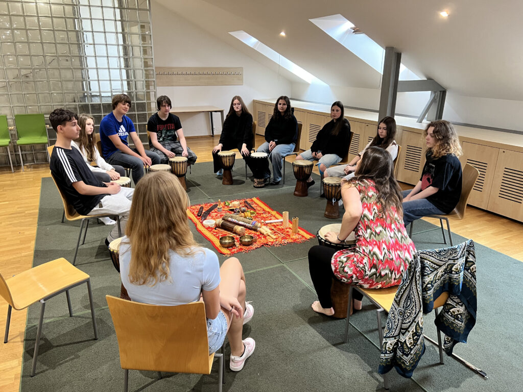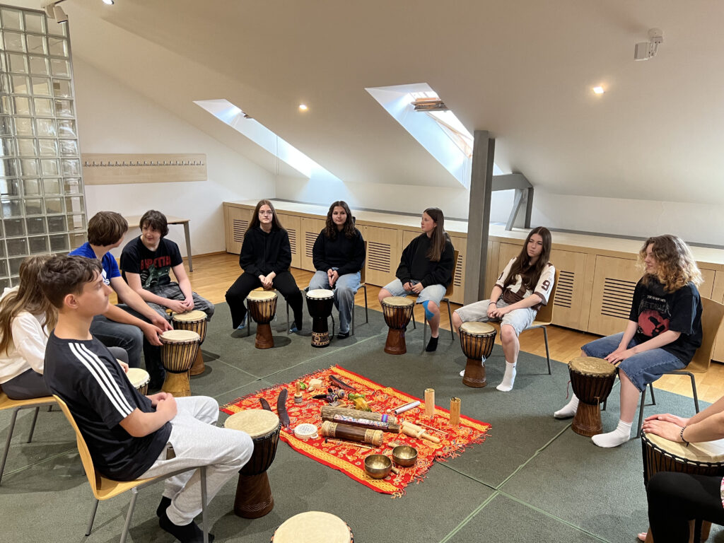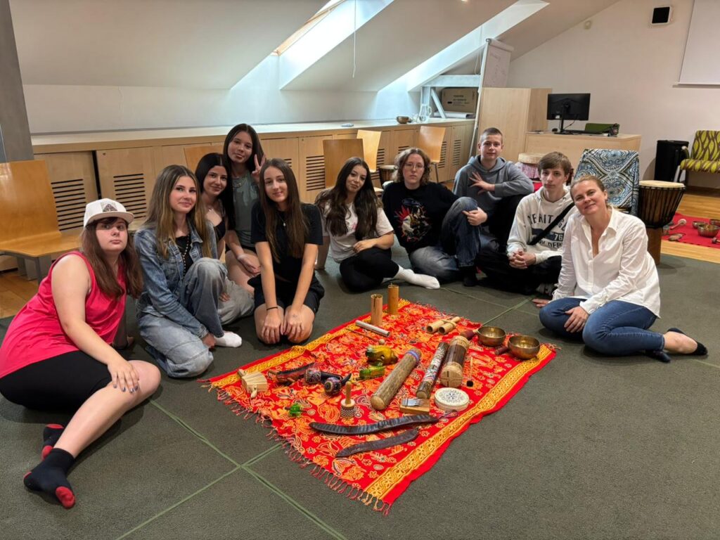 V úterý 3. června 2025 jsme se vydali do Knihovny Jiřího Mahena na výukový program Bubnohraní. Tím nás provedla vedoucí Hudební knihovny Jitka Málková, která nás seznámila s netradičními bicími nástroji, jako jsou djembe, dešťová hůl a sloup, čaringa, tibetské mísy, zvonkohry reprezentující jednotlivé živly nebo ocean drum. Pomocí nich navodila velice příjemné relaxační chvilky, které byly prostřídány hrou na některé ze zmíněných nástrojů, jež měli někteří z nás v ruce poprvé.